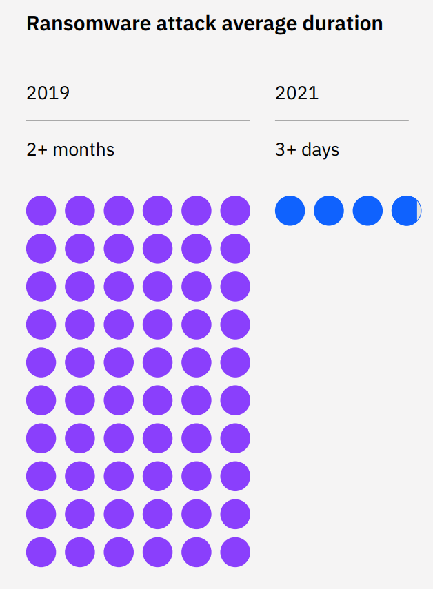 시간당 $540,000에 이릅니다. 물론 비즈니스 및 환경의 특성에 따라 구체적인 비용 다릅니다. 이렇게 높은 비용을 고려할 때 사이버 공격으로 인한 침해 기간은 짧을수록 좋습니다. 따라서 공격을 당한 이후에는 빠르게 시스템을 정리하고 복원하도록 해야 합니다.