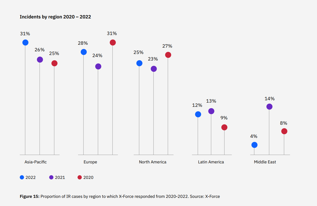 반면, IBM의 연례 보고서인 X-Force Threat Intelligence Index에 따르면 지난해 전체 사이버 공격 중, 31%가 아시아 태평양 지역에서 발생했습니다. 2021년 (26%)에 이어 전 세계에서 가장 많은 사이버 공격을 받는 곳이 아시아 태평양 지역인 것으로 나타난 것입니다. 특히 아시아 태평양 지역에서는 제조업(48%)과 금융 및 보험업(18%)을 타겟으로 한 공격이 상당수를 차지했고, 공격 수법으로는 스피어 피싱(40%) 형태가 압도적이었고 애플리케이션을 악용한 방법은 22%로 그 뒤를 이었습니다.