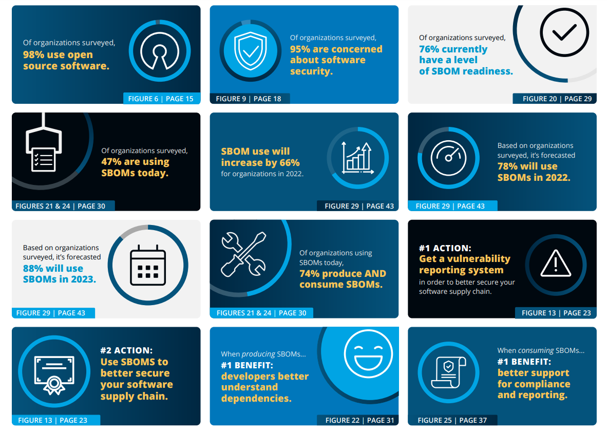 리눅스 재단은 SBOM이 오픈소스 생태계 전반의 사이버 보안을 개선하는 데에 미치는 중요성에 대한 연부 보고를 발표했습니다. SBOM을 생성할 때 얻을 수 있는 주요 이점 세 가지에 대한 답변으로 애플리케이션 구성 요소 간 의존성(dependency)에 대한 쉽고 빠른 파악이 51%, 구성 요소의 취약점 모니터링 용이성이 49%, 라이선스 컴플라이언스 관리 용이성이 44%의 비율을 차지했습니다. SBOM을 사용함으로써 얻을 수 있는 주요 이점 세 가지는 무엇인가에 대한 질문에서는 컴플라이언스 및 보고 요구사항을 보다 효과적으로 지원(53%)한다는 점과 위험 기반 의사결정을 가능하게 하는 정보를 제공(53%)한다는 점이 가장 큰 이점이라고 답했으며, 라이선스 컴플라이언스 관리 용이(44%)와 취약점에 대한 신속한 파악(49%)이 뒤를 이었습니다.