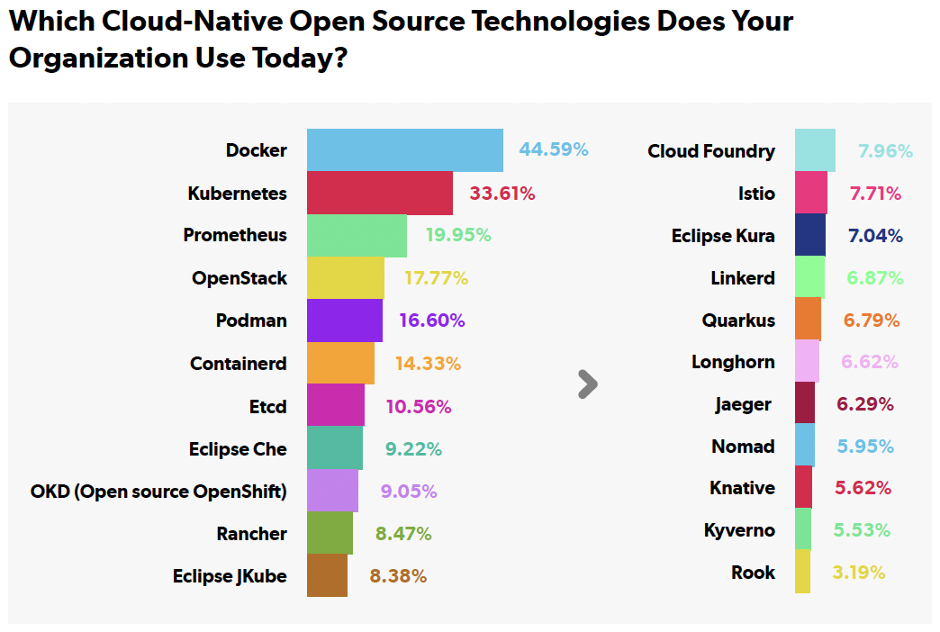 오픈소스에서 클라우드 네이티브 소프트웨어가 가장 큰 성장을 한 것으로 조사되었습니다. 컨테이너 기반 기술과 쿠버네티스 네이티브 배포가 트렌드로 자리잡으며 클라우드 네이티브 환경을 지원하는 오픈소스 툴의 확산이 눈에 띄었습니다.
