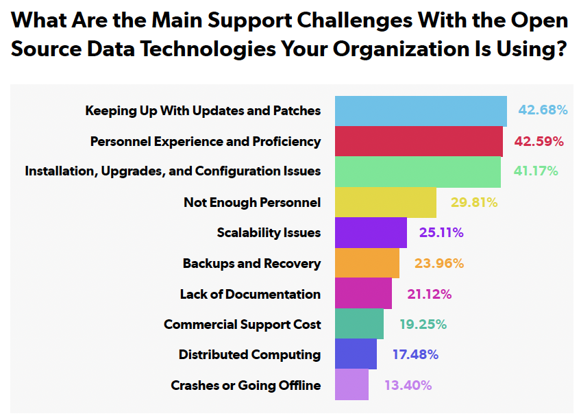 보고서에 따르면 오픈소스 데이터 기술 서포트와 관련된 어려움에 대한 질문에 대하여 상위 4개의 어려움이 인력부족과 기술지원 부족인 것으로 조사되었습니다.