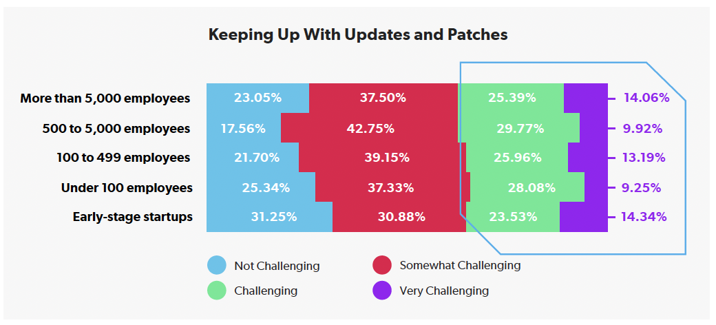특히 모든 규모의 기업에서 오픈소스 최신버전으로 업데이트와 패치 작업이 가장 어려운 일이라고 답하였습니다.