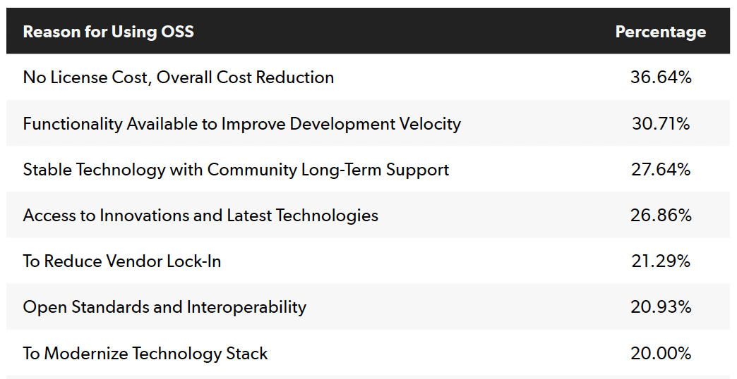 기업의 오픈소스를 선택하는 이유에 대한 질문에 대해 오픈소스를 사용하는 이유로는 ‘라이센스 비용 절감/전체 비용 절감’이 36.64%로 조사되었으며, 개발 속도 증가를 위한 기능성 (30.71%), 커뮤니티의 장기 서포트로 인한 안정적 기술(27.64%)로 나타났습니다.